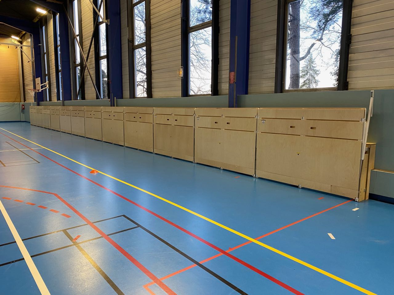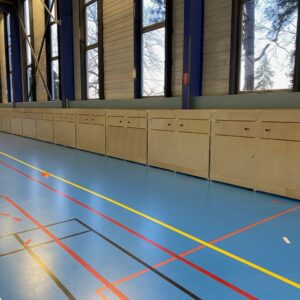Afin de répondre à la demande initiale, Idequipe a choisi d’installer des tribunes 2 rangs sur-mesure qui permettent d’accueillir 96 personnes. Les murs et poteaux n’étant pas alignés, Idequipe a proposé la réalisation d’un coffrage afin de reconstituer une ossature qui harmonise la structure sur laquelle viennent reposer les tribunes et ainsi s’imbriquer intelligemment.